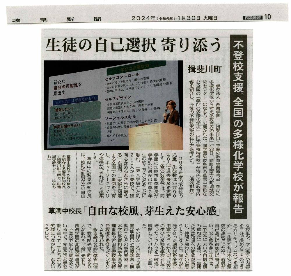 岐阜新聞に掲載されました【生徒の自己選択 寄り添う 不登校支援、全国の多様化学校が報告 草潤中校長「自由な校風、芽生えた安心感」】