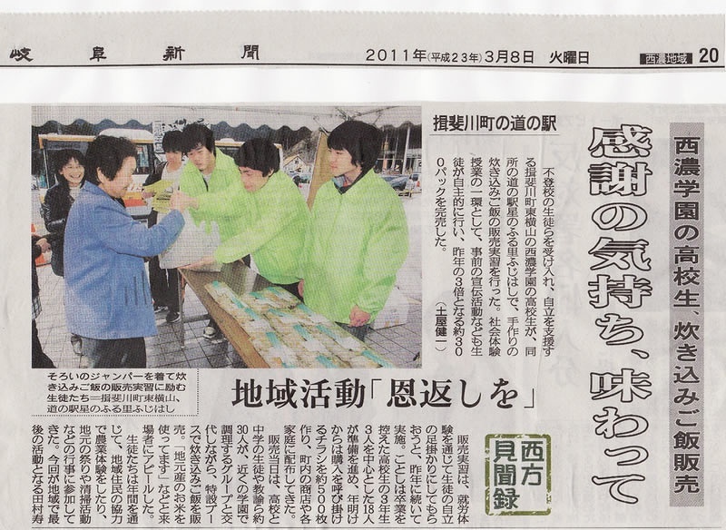 不登校の生徒らを受け入れ、自立を支援する揖斐川町東横山の西濃学園の高校生が、同所の道の駅星のふる里ふじはしで、手作りの炊き込みご飯の販売実習を行った。 社会体験授業の一環として、事前の宣伝活動なども生徒が自主的に行い、昨年の3倍となる約300パックを完売した。 文・土屋健一