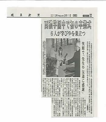 不登校の生徒を受け入れ自立を支援する、揖斐郡揖斐川町東横山の学校法人西濃学園中学校で10日、卒用証書授与式が行われた。2009(平成21)年度に開校した同校は、本年度が第1期の卒業生で、6人が学びやを巣立った。