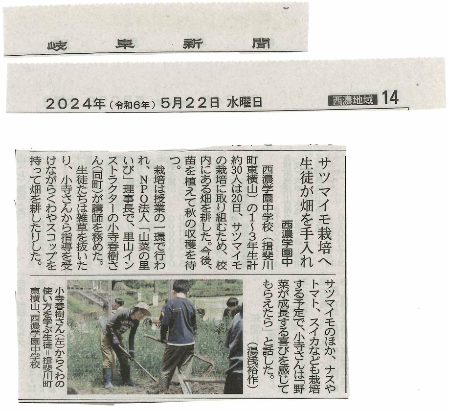 岐阜新聞に掲載されました【西濃学園中 サツマイモ栽培へ 生徒が畑を手入れ】