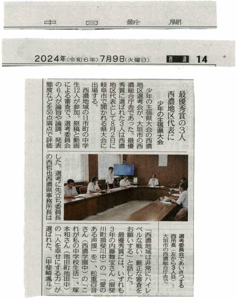 中日新聞に掲載されました【最優秀賞の3人 西濃地区代表に 少年の主張県大会】