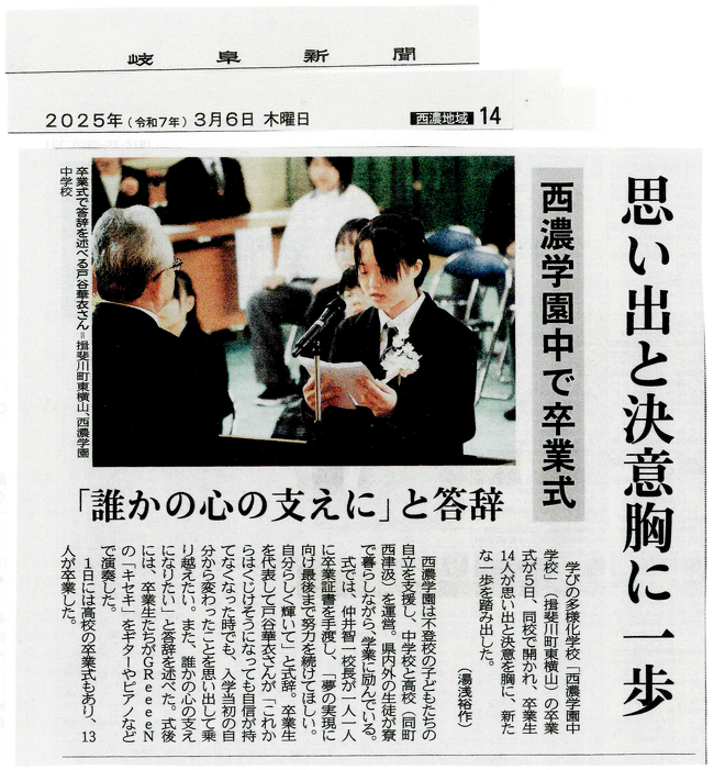 岐阜新聞に掲載されました【思い出と決意胸に一歩 西濃学園中で卒業式 「誰かの心の支えに」と答辞】