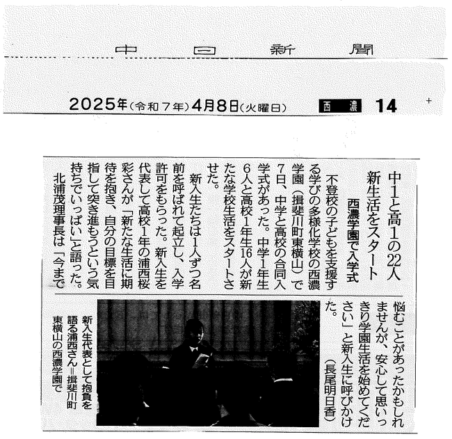 中日新聞に掲載されました【中1と高1の22人 新生活をスタート 西濃学園で入学式】