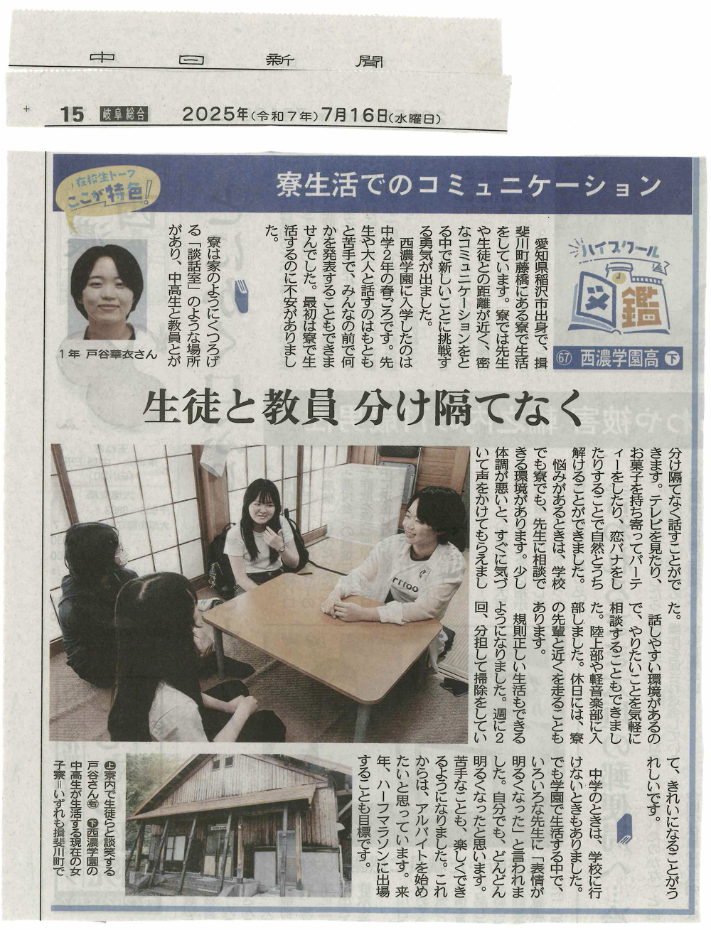 中日新聞に掲載されました【寮生活でのコミュニケーション 生徒と教員 分け隔てなく】