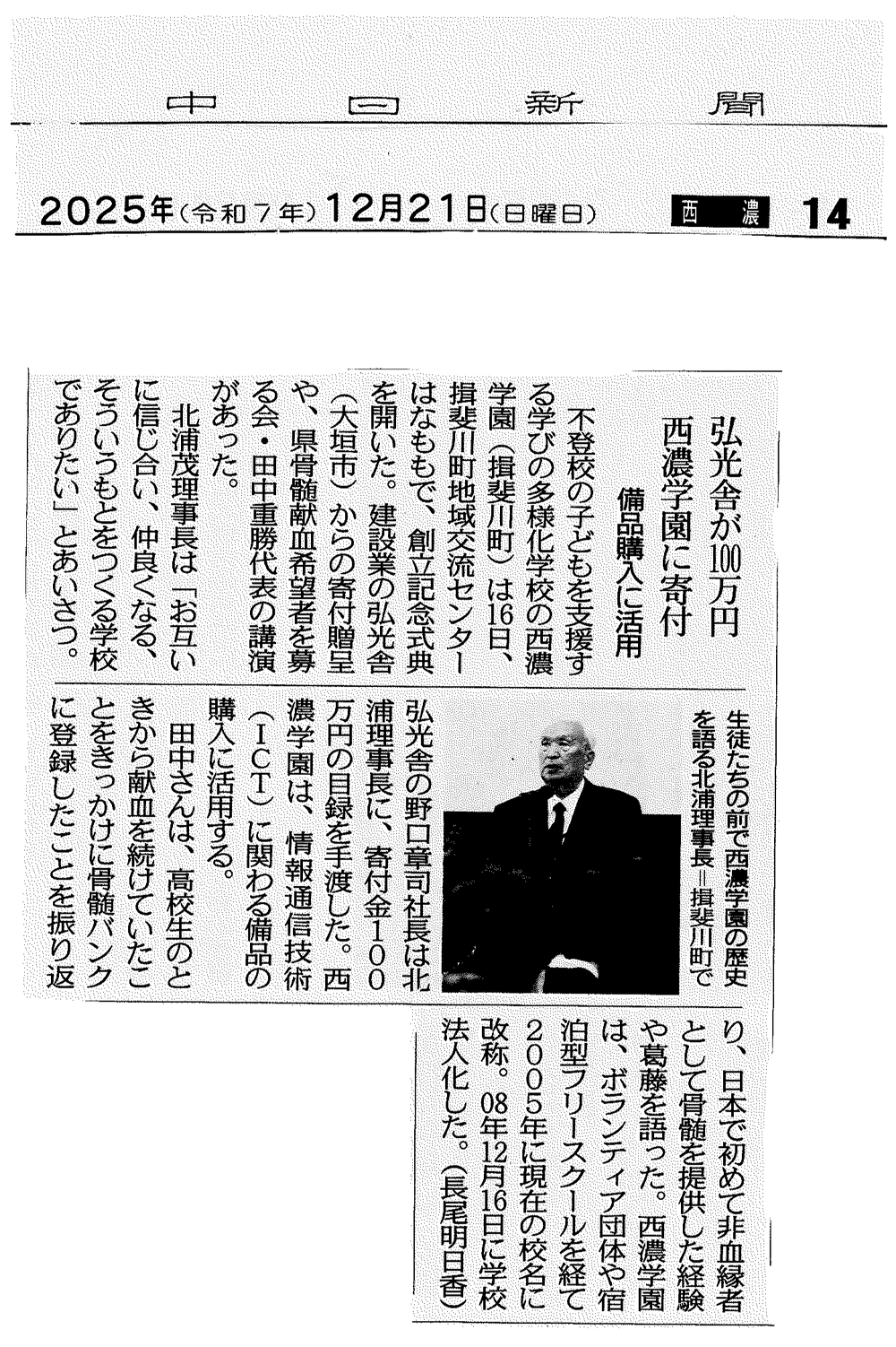 中日新聞に掲載されました【弘光舎が100万円 西濃学園に寄付 備品購入に活用】