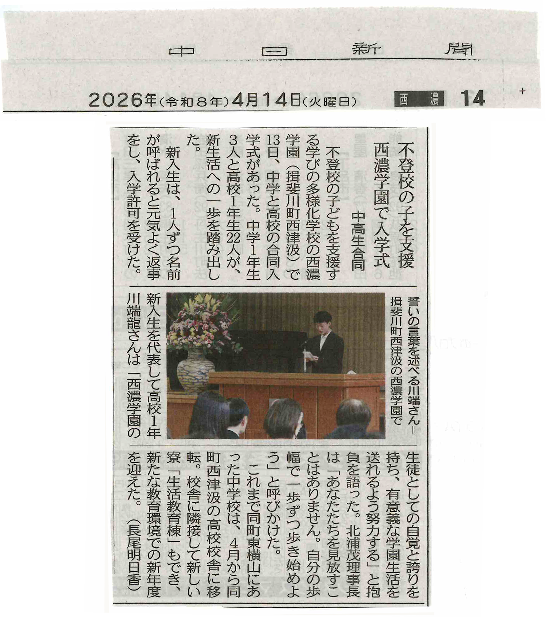 中日新聞に掲載されました【不登校の子を支援 西濃学園で入学式 中高生合同】