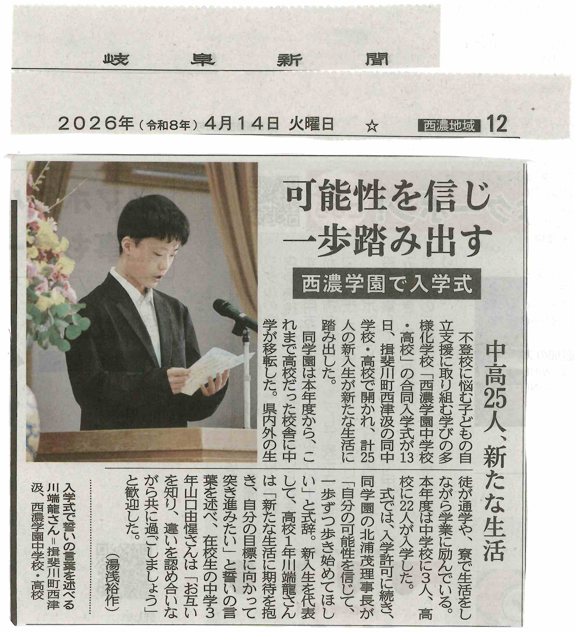 岐阜新聞に掲載されました【可能性を信じ一歩踏み出す 西濃学園で入学式 中高25人、新たな生活】