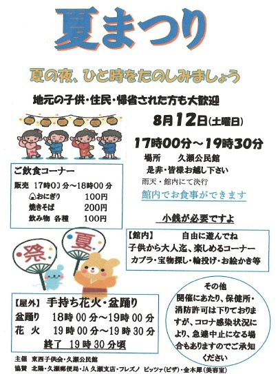8月12日(土)17時から、久瀬公民館で夏なつりが開催されます。 高校の職員も参加します! 生徒の皆さん、卒業生の皆さん、お時間がありましたらぜひお越しください。 ただし、公共の交通手段が乏しいですのでご家族の方などに送迎をしていただくことをおすすめします。